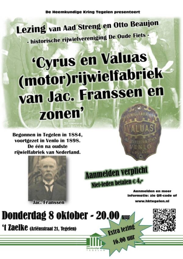 Door Aad Streng en Otto Beaujon is een boek geschreven over de Tegelenaar Jac. Franssen en zijn Cyrus en Valuas (brom)fietsen. Aad en Otto zijn leden van de historische rijwielvereniging De Oude Fiets (www.oudefiets.nl), de enige historische rijwielvereniging van Nederland met 750 leden. Op de website van Vereniging de Oude Fiets is het boek van…
