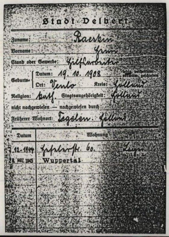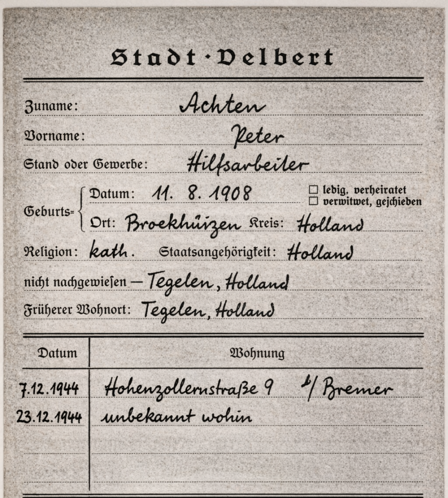 Inschrijvingsformulier Velbert, hier wordt de naam Peter Achten gebruikt. Bron Arolsen Archives.