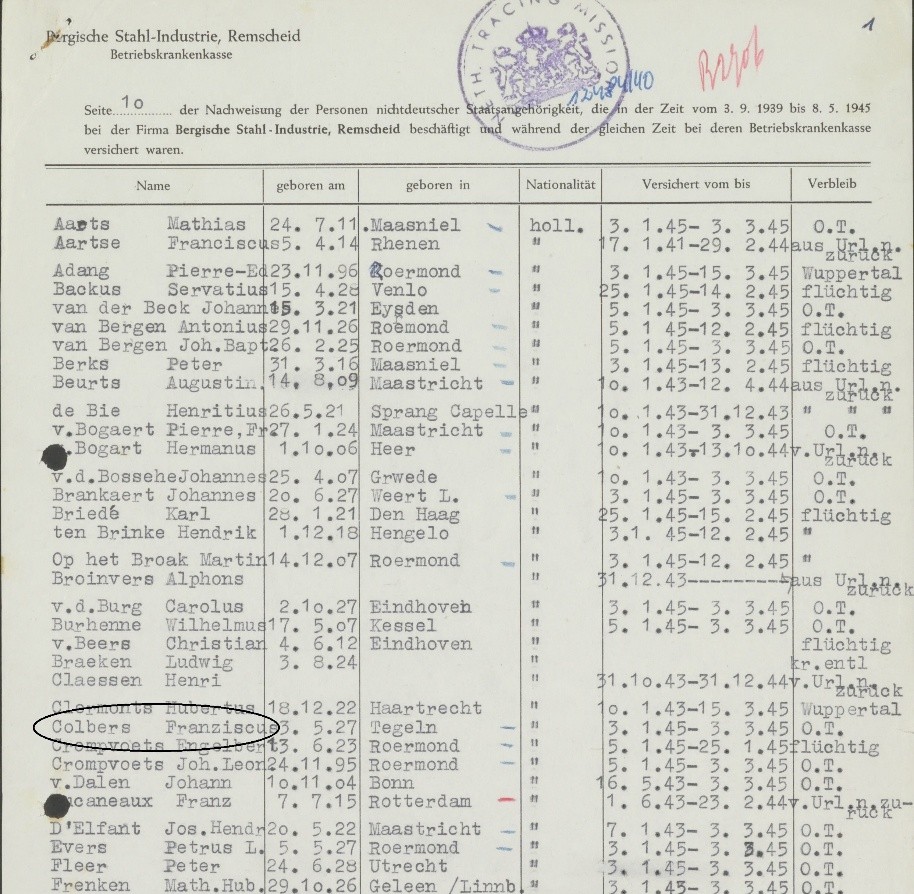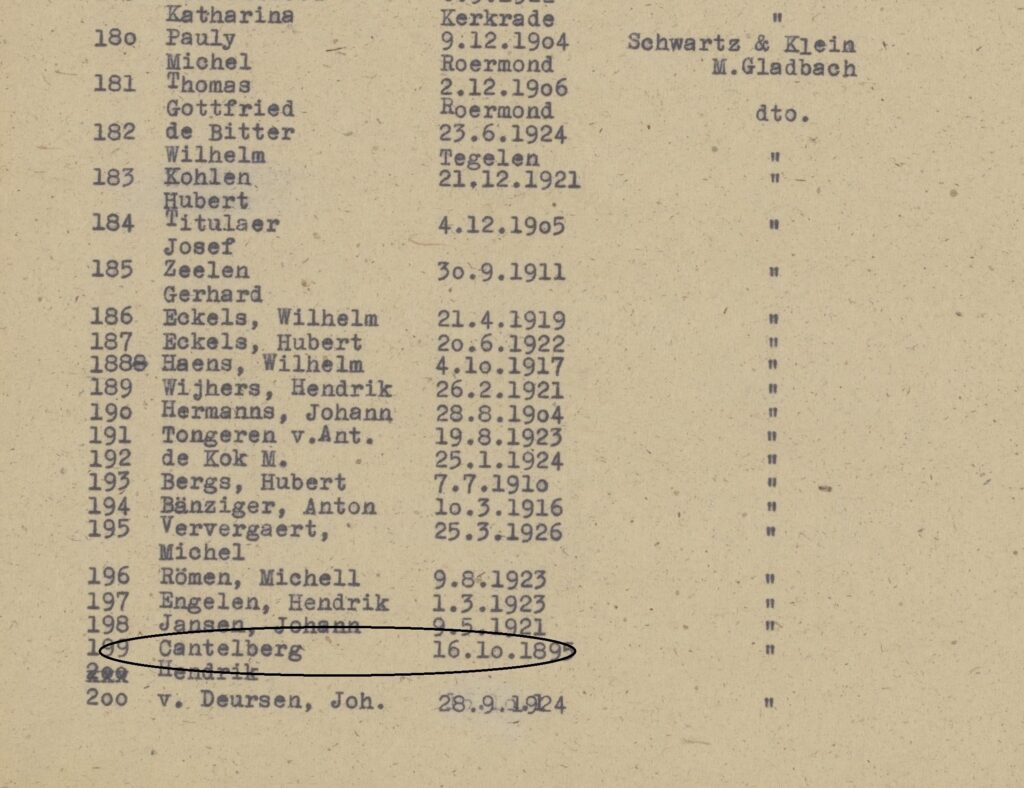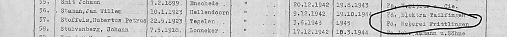 Op regel 3 van dit overzicht van arbeiders van de firma Dynamit in Lichtenau staat Wilhelm Gerard van Biyk, geboren 26.12.1921. In werkelijkheid is dit Wiel van Eijk, geboren 26.11.1921, woonachtig in Tegelen, Industriestraat 41. Of Wiel zijn naam bewust verkeerd heeft opgegeven om represailles richting zijn familie te voorkomen of dat de Duitsers, welk ook voorkwam, gewoon de naam verkeerd geschreven hebben, is helaas niet bekend. Op 10 oktober 1942 arriveert Wiel van Eyk bij Dynamit in 1942 om daar uiteindelijk tot 20 september 1944 te verblijven. Of hij vanuit Lichtenau gelijk naar huis is gestuurd of dat hij gevlucht is, is helaas niet bekend.