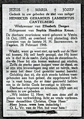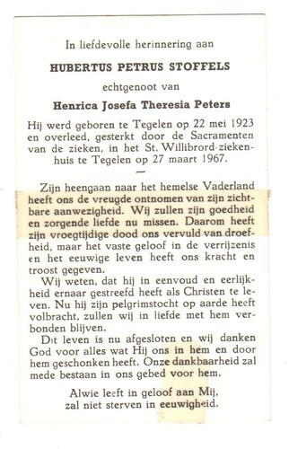 In 1974 is Sjeng in Terneuzen overleden waarna hij wel in Tegelen werd begraven.