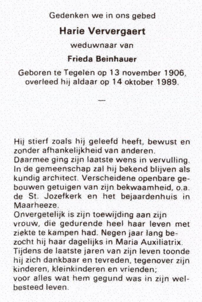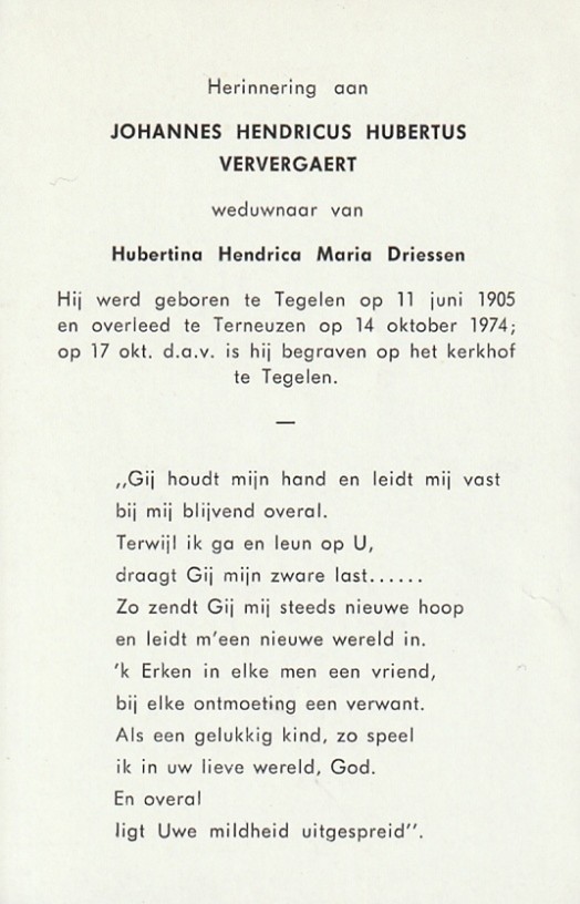 De oudste zoon Piet Ververgaert, geboren in 1938, die in Utrecht woont, kon ook geen verder details geven. Hij wist wel dat zijn vader in Duitsland heeft gewerkt. Zijn vader nam wel eens tinnen soldaatjes mee die hij op zijn reizen naar Berlijn had gekocht voor zijn zoon.