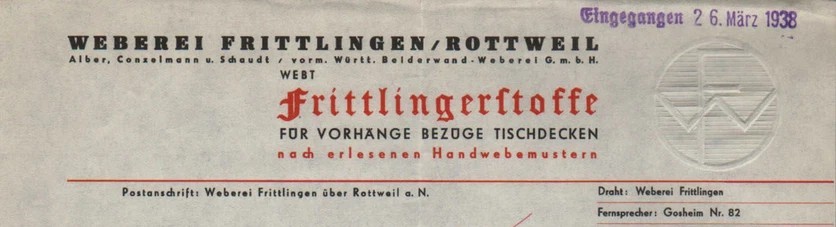 Briefhoofd Weberei Frittlingerstoffe, Werk Taiflingen. Bron: Archief Tuttlingen