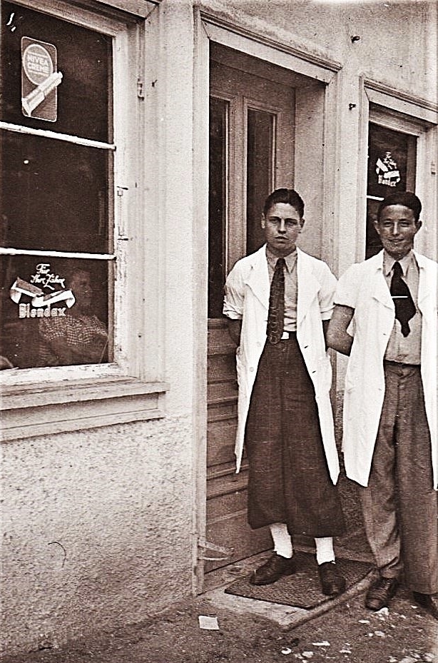 Circa 1944 – Baer Stoffels (links) voor de kapperszaak van fam. Lorch in Tuttlingen. Persoon rechts is onbekend. Bron: Theo Hoezen