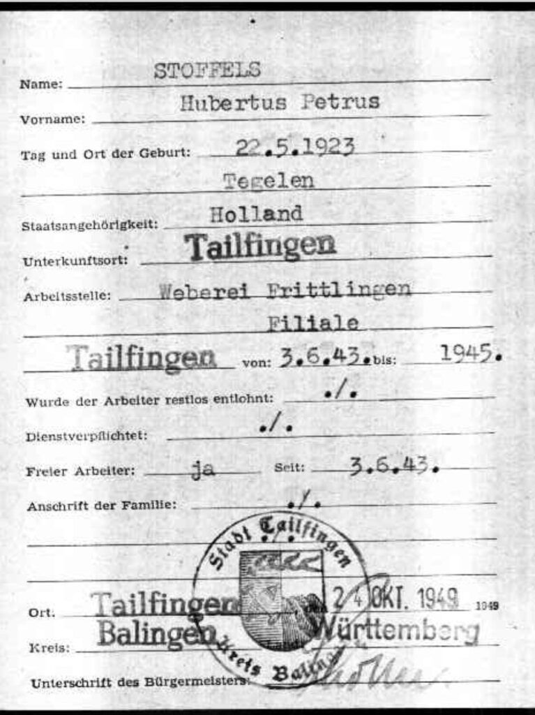 Allereerst het verhaal zoals wij dit konden reconstrueren uit de verschillende documenten die zijn gevonden op de website van de Arolsen Archives. Daar komen we zijn naam tegen als arbeider bij de firma Weberei Frittlingen in het kleine dorpje Tailfingen in Württemberg. Volgens de documenten zou Baer Stoffels hier vanaf maart 1943 hebben gewerkt en pas aan het einde van de oorlog zijn gestopt. Tijdens de oorlogsjaren werden in de weverij onder andere zeildoeken voor vrachtwagens gefabriceerd.