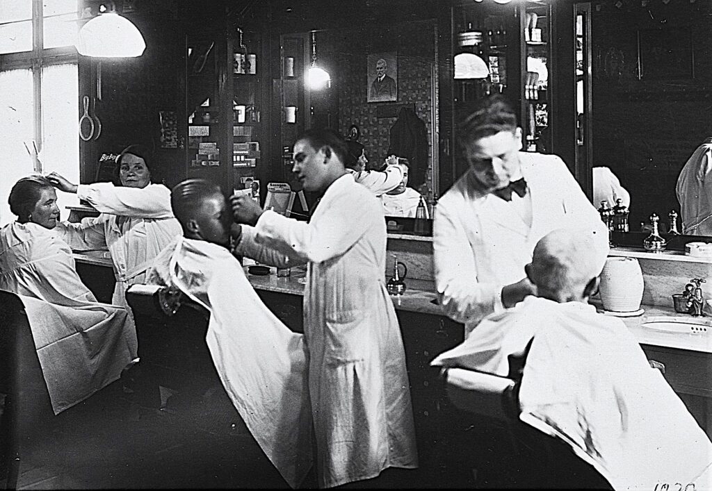 1930 de kapperszaak op Steyl. Links Tienke Stoffels, rechts Sjeng Stoffels, midden onbekend. Collectie: Theo Hoezen