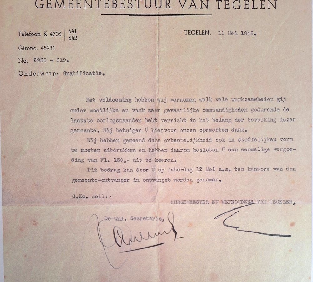 Erkenning van zijn inzet tijdens de laatste oorlogsmaanden door het gemeentebestuur van Tegelen. Collecte: Twan Hendriks.