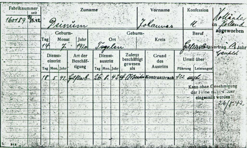 Of Jan op 10 mei 1940 gevangen genomen is weten we helaas niet. Wat we wel weten is dat hij op 18 mei 1942 moet gaan werken bij de firma Friedrich Krupp AG in Essen, een reusachtige gieterij. Al snel heeft hij het daar gezien en op 26 augustus 1942, iets meer dan drie maanden in dienst, vlucht hij terug naar Nederland, waar hij onmiddellijk onderduikt.