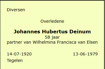 Een van de velen die hebben moeten werken en van wie wij enige informatie hebben, is Jan van Deinum. Op 14 juli 1920 zijn Klaas van Deinum en Maria Egbers in Tegelen blij met de geboorte van hun zoon, die zij Johannes van Deinum noemen, met als roepnaam Jan. Jan zijn ouders wonen op dat moment op de Julianastraat in Tegelen en zullen later naar Blerick verhuizen.