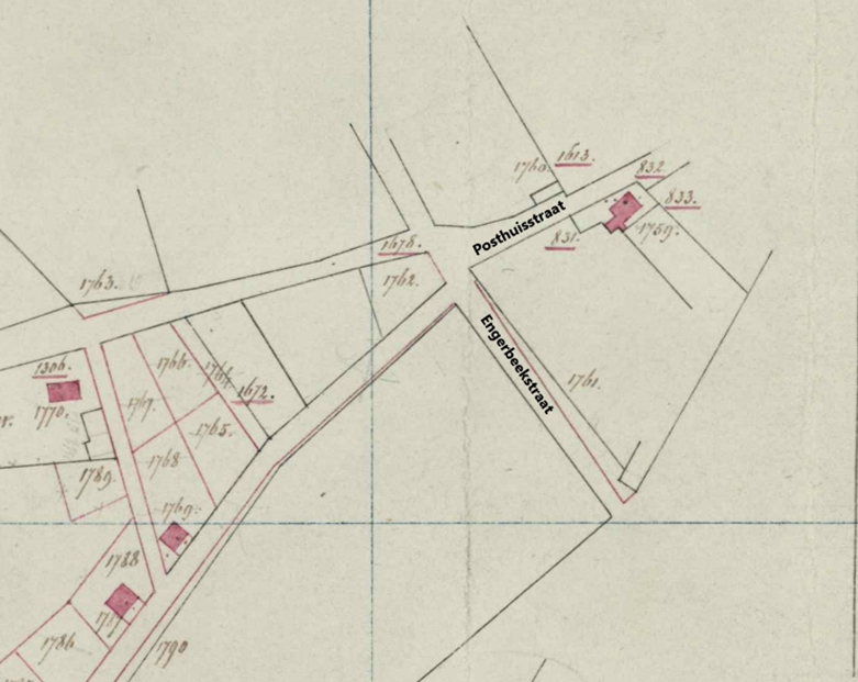In 1842 zag de driehoek Posthuisstraat-Engerbeekstraat-Grotestraat er als volgt uit, met de toenmalige sectienummers zoals vermeld in de eerste kadastrale kaarten en vastleggingen (bron: aezel.eu):