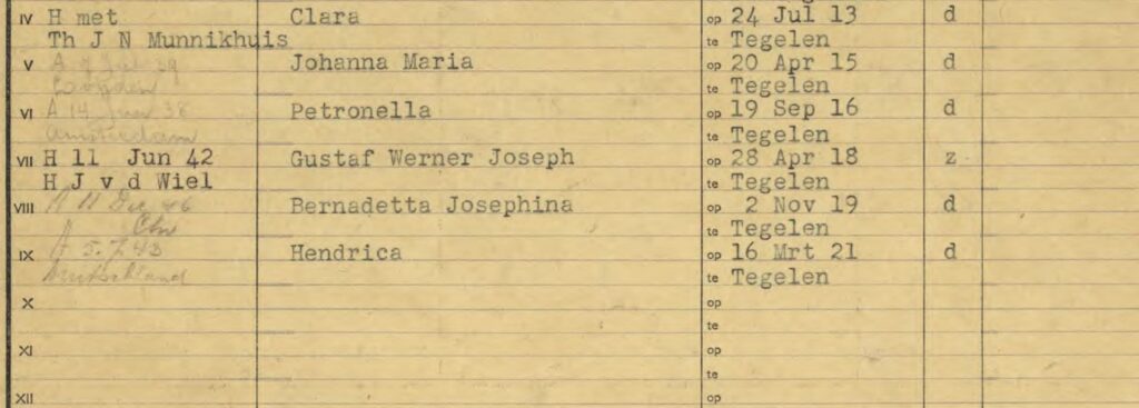 | Jacoba Hendrika | WILMS | Tegelen | 7 januari 1893 | Jacoba Hendrika | v | Tegelen | 13-10-1974 | Venlo | e | Martens + | Francis | v | e | Maassen+ | Theodor | m | |||