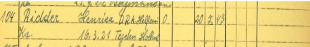 Vermelding van Henrica (Hendrika) Ridder. Bron: Arolsen Archives