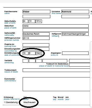 19 maart 1943 wordt Weber ingeschreven in Mauthausen. Bron: Bundesarchiv Berlin