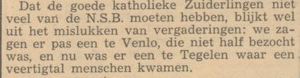 Ook in Tegelen zijn minder fraaie bladzijden geschreven, soms zelfs zwarte. Al vaker wordt in diverse publicaties gewag gemaakt van NSB’ers in Tegelen. Reeds in april 1935 organiseert de NSB een bijeenkomst in Tegelen. Waar De Nieuwe Venlose Courant schrijft dat er in katholiek Limburg geen plek is voor de NSB, melden zich in Tegelen veertig mensen voor deze bijeenkomst.[1]