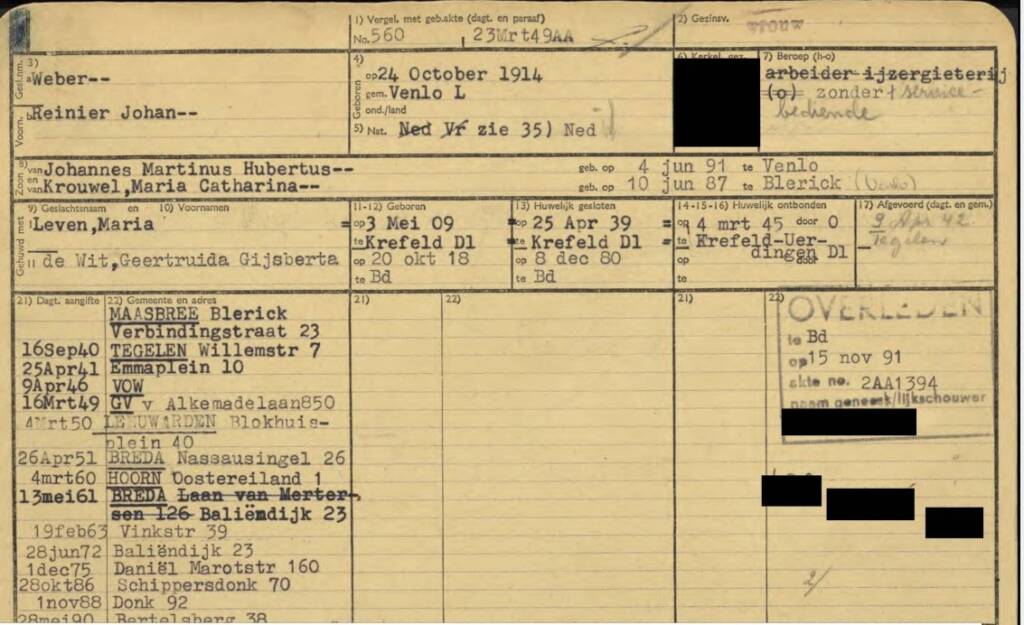 | Gerardus Johannes Mathias | WEBER | Tegelen | Kerkrade | 17 november 1922 | Gerrit | m | Kerkrade | 7-9-1996 | Venlo | e | Beckers | Christien | v | ||||||