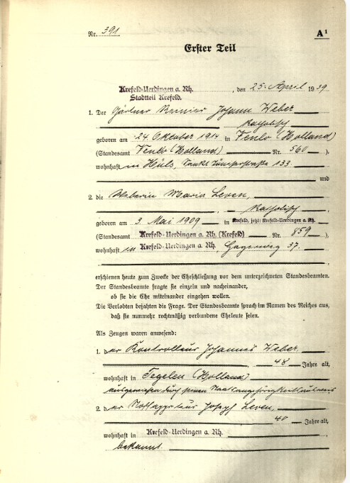 [2] Hūls was tot 1975 een zelfstandige gemeente enkele kilometers boven Krefeld gelegen. Op de bijlage van de trouwakte wordt vermeld dat beiden Deutschblūtig zijn, een term uit de Blut- und Bodentherorie van het Nationaalsocialisme.