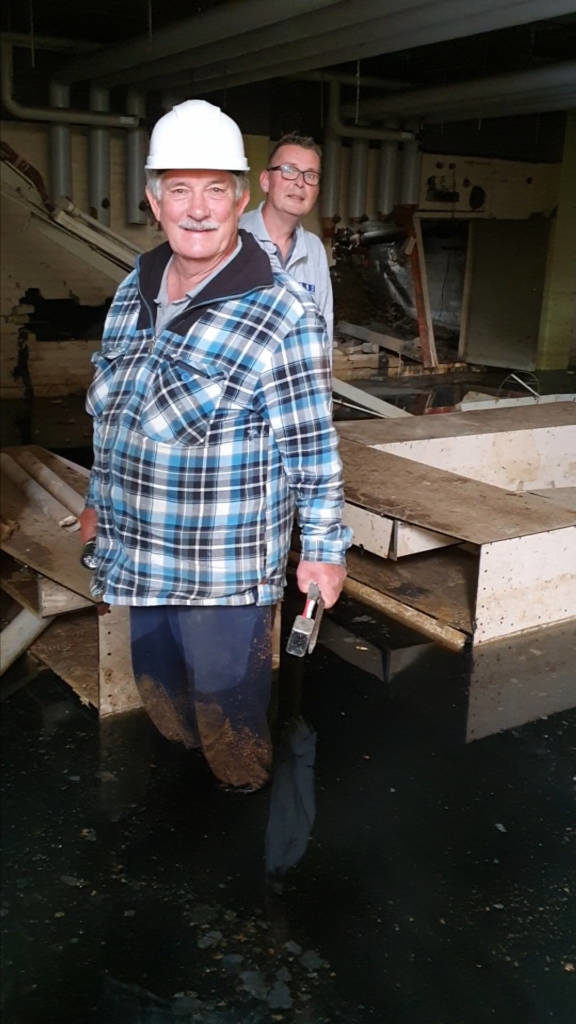 Met helm, laarzen, zaklampen, moker, beitel en breekijzer betraden we het ketelhuis. De laarzen waren net te laag, of het water in de kelder net te hoog, om droogvoets bij de tunnels te komen. Na kruipen, klimmen en ‘sjravele’ langs de buizen kwamen we bij de gemetselde muur. Het kostte ons veel moeite om de eerste steen los te breken; na een half uur lukte het om een gat in de muur te krijgen. Met een camera konden we de ruimte aan de andere kant van de muur filmen. Helaas. Een kleine ruimte van ongeveer 2 bij 2 meter zonder verdere gangen. Dit kon onmogelijk de schuilkelder zijn. We hopen maar weer op nieuwe aanwijzingen….